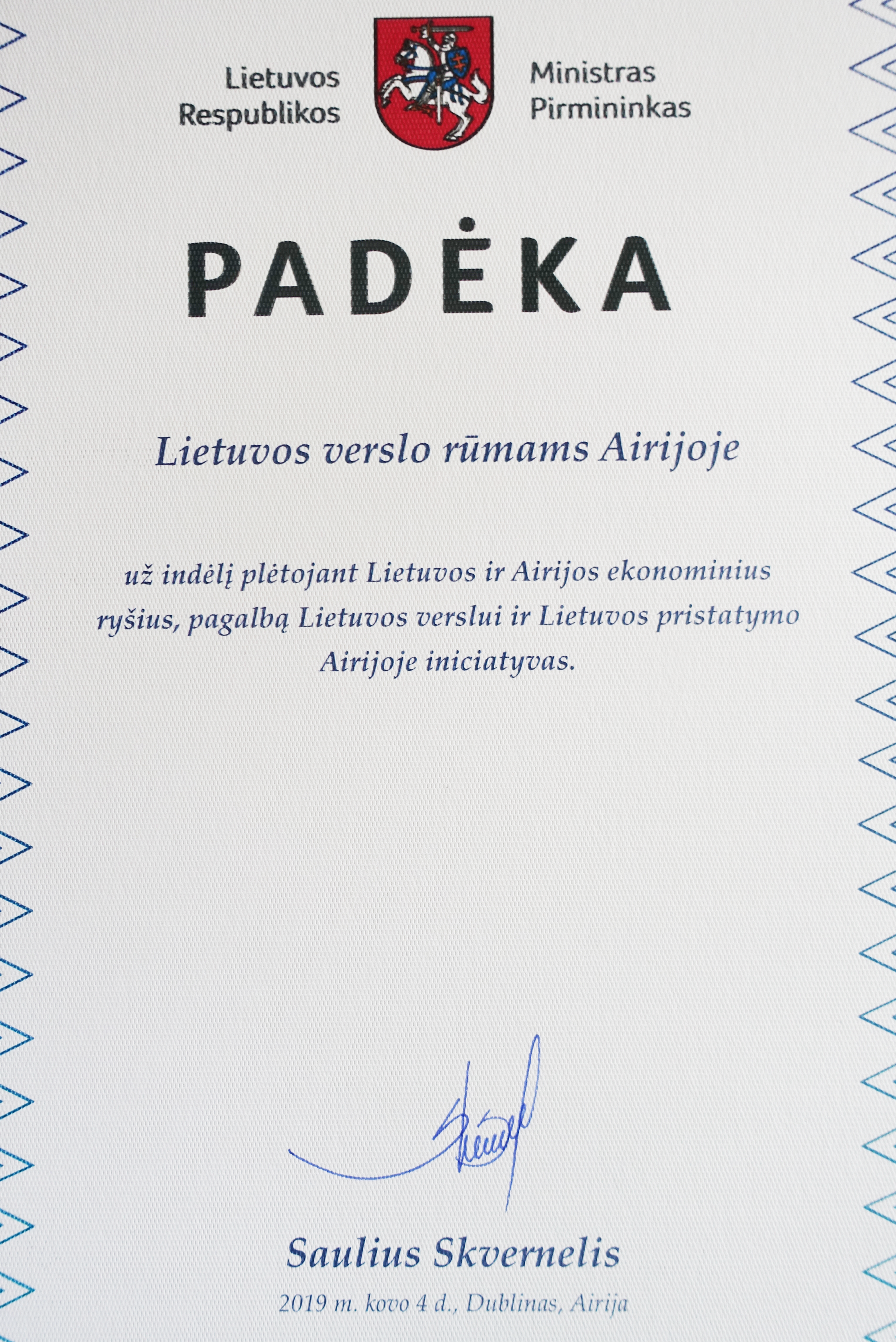 Lithuanian Chamber of Commerce in Ireland has been awarded by Lithuanian Prime Minister Saulius Skvernelis for contribution in building up economic and business relationship between Ireland and Lithuania. Lithuanian Chamber of Commerce in Ireland sponsored Lithuanian Prime Minister’s evening conference and awards.